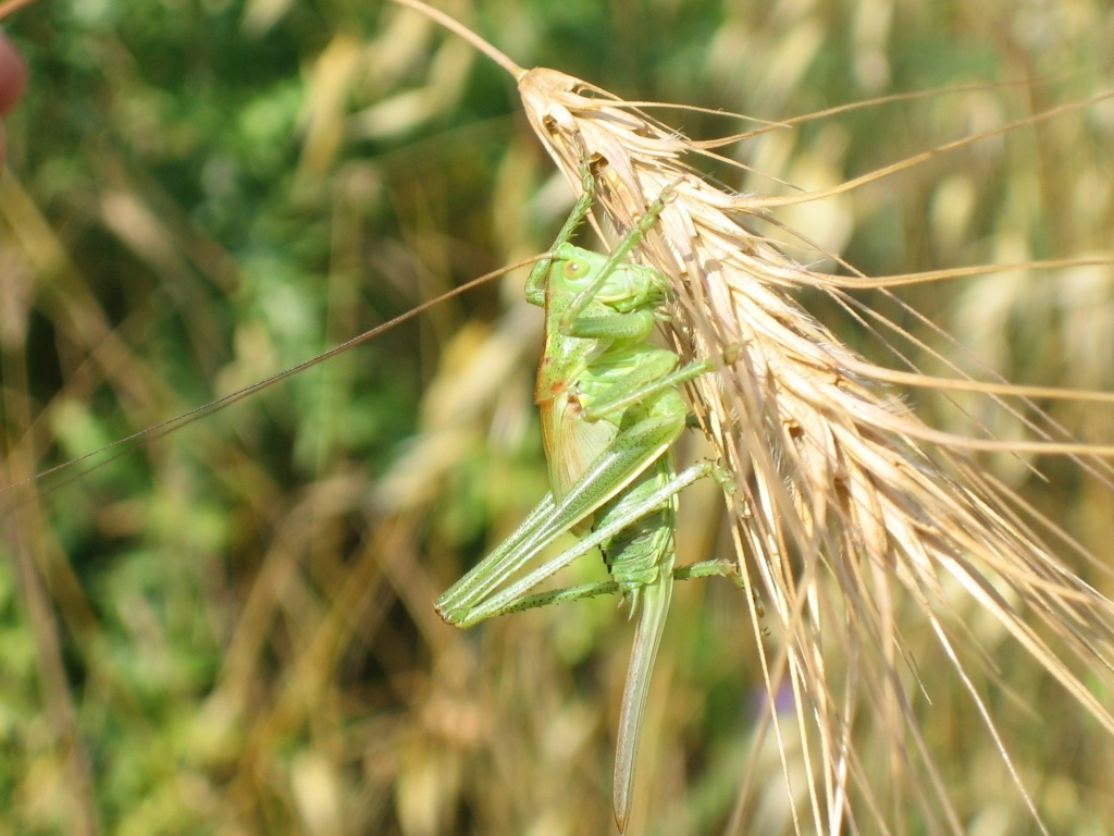 Comprendo i limiti del mezzo, ma io sinceramente vedo ben poco da salvare di questo scatto. Iniziamo dal taglio...sembra buttato lì...sotto la coda della cavalletta è al limite di fotogramma e a sinistra hai tagliato le antenne, ma sei riuscito a far vedere qualche accenno di dita che tiene la spiga ...l'esposizione è scorretta, tutto e parecchio sovraesposto e anche lo sfondo non è il massimo.