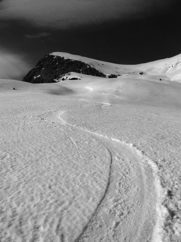Il problema secondo me sono neve e luce. La prima è vecchia e con un brutto aspetto e troppo compatta per lasciare bei solchi, la luce avrebbe dovuto essere ancora più radente per questo tipo di composizione.