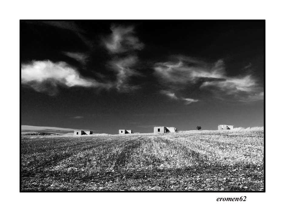 bel contrasto tra la luminosità (bianchi) delle nuvole, del pp e delle casette ed il nero del cielo. le nuvole hanno vaghe forme di fantasmi..
