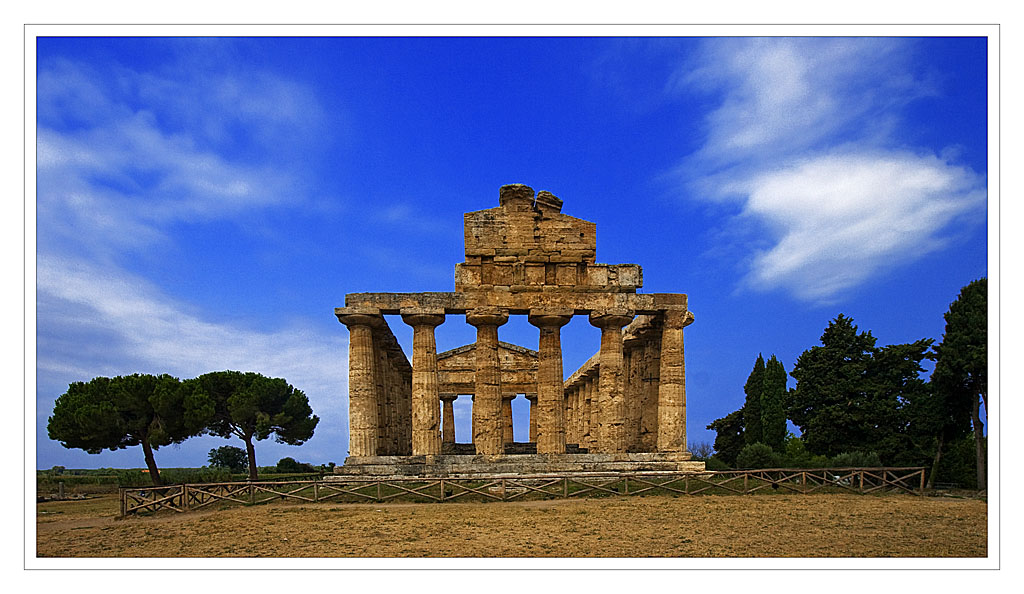 Direi Paestum. Bella è bella, indiscutibilmente bella la resa dei colori con un pò di magenta di troppo (!!??). Ma forse è colpa del monitor. Mi piace anche il taglio panoramico e la cornice creata dalle nuvole. Avrei scelto una ripresa che restituisse una maggior simmetria delle colonne del tempio e, di conseguenza, una prospettiva più precisa.
