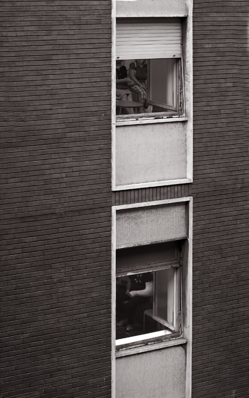 Con questi vincoli io mi sarei limitato alla finestra di sotto, il braccio ingessato è già interessante (proprio quello richiama il film di Hitchcock, rovesciandone però il punto di vista).