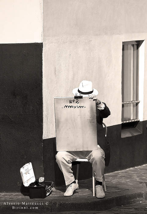 Un immagine misteriosa ed affascinante, ricca di enigmi visivi. Una fotografia da scoprire. Sia il volto dell’artista sia la sua opera ci sono precluse allo vista. Innanzi tutto viene a mancare quello di cui ogni essere umano ha di più caro, il suo sguardo, il suo volto, la sua identità; e ci è precluso anche il piccolo lavoro del pittore dal cappello elegante, rendendo impossibile il partecipare per un attimo al suo mondo artistico, e di immaginare quali erano i suoi soggetti, se erano presenti nella strada o solo nei suoi pensieri. Sappiamo solo che è il numero 2……maxim……. Immagine surreale, lontana, un appannamento dei nostri sensi, un distacco dal sé e dalla realtà. Tutto sembra in silenzio, come durante l’ascolto delle note di una melodia, e che si fa richiesta di ascolto visivo. La composizione fotografica è eccellente: tutti i margini del fotogramma sono curati : il personaggio principale è inserito all’interno del fotogramma in maniera equilibrata: risulta avvolto da tutta una serie di geometrie rettangolari, innanzi tutto dai meravigliosi scampoli di muro, dalla tavolozza da disegno personalizzata, dalla scatola degli attrezzi del mestiere, dalla finestra sulla destra. A tutto questo fa contrasto quell’elegante e raffinato cappello di forma circolare che insieme ai frammenti di giacca scura, camicia bianca e orologio da polso ci danno degli indizi sulla classe dell’artista da strada. Un’altra ottima foto di Alessio, così sei firmato alla base dell’immagine insieme al link del tuo sito personale: avrei preferito che questi simboli non partecipassero all’ atmosfera della fotografia……