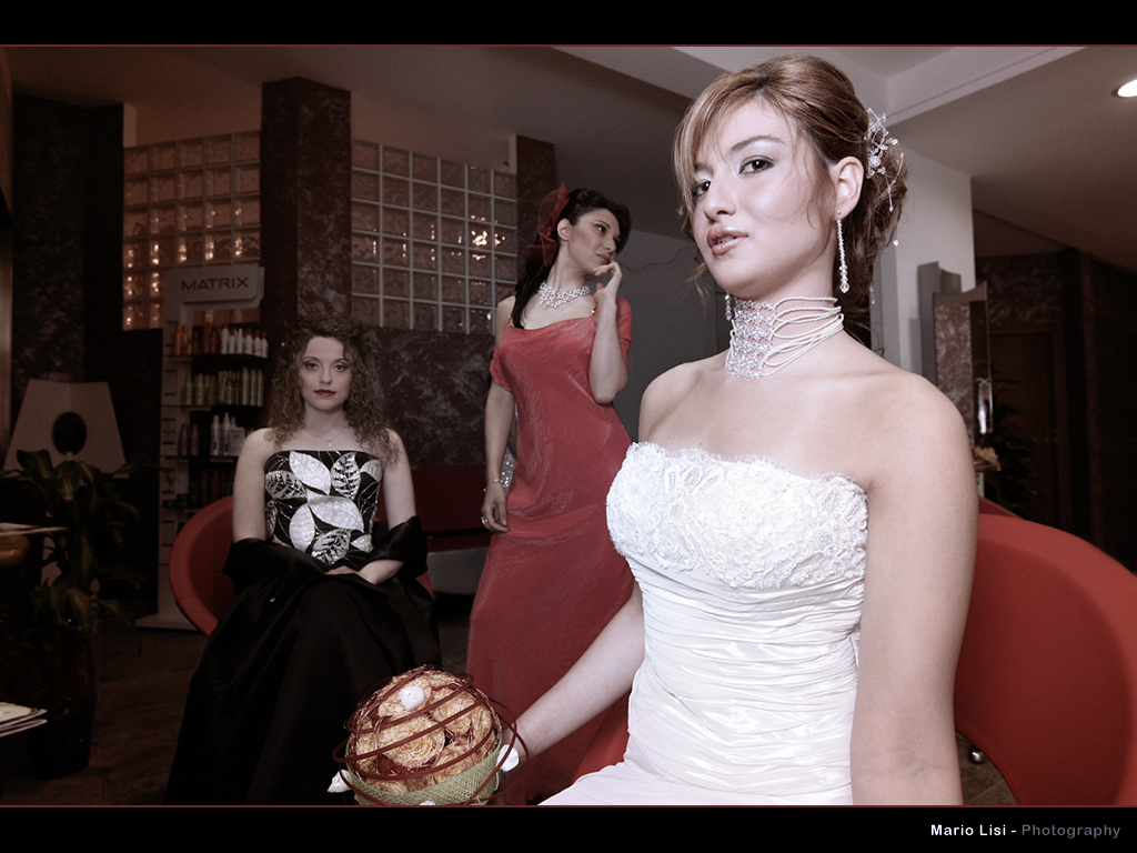 Personalmente nella scena avrei tenuto solo la modella in rosso, colta in una posa ed espressione davvero magnifiche, la modella in primissimo piano ha un'espressione e una postura che mi comunicano solo tensione e' come se fosse costretta a stare in una posizione vincolata e avesse solo spostato in maniera forzata gli occhi verso il fotografo, inoltre il bouquet e il braccio cosi tagliati non mi convincono appieno, l'altra modella sulla sfondo diciamo pare un pochino inespressiva, non coinvolta nello scatto.