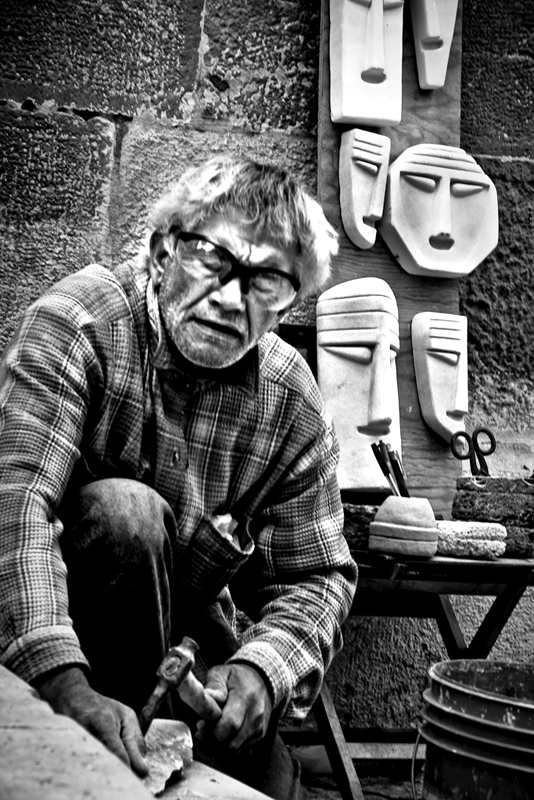 Alla buona nitidezza e leggibilità di quelle che dal titolo, ma si sarebbe ugualmente inteso, sono il soggetto, ossia le maschere, si contrappone al lavoro apparentemente mal eseguito sull'artigiano, dove sfocato e durezza di contrasti accumunano lui stesso alle sue creature.
