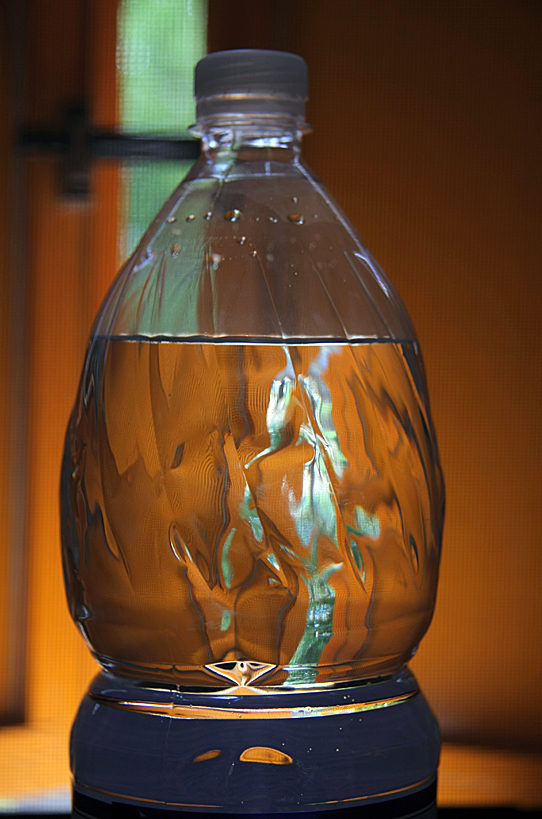 Basti osservare come hai curato che la linea di galleggiamento del liquido nella bottiglia corrispondesse alla base del vetro, in modo da ottenere una variazione cromatica a tutta prima spiazzante.....