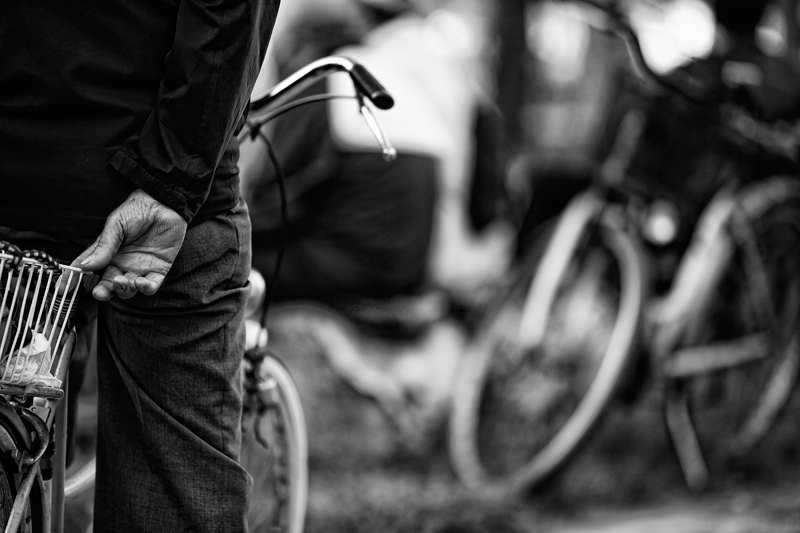 In questa un riferimnto all'uomo c'è ma il centro d'interesse si divide fra la mano e la bici fuori fuoco nello sfondo...
