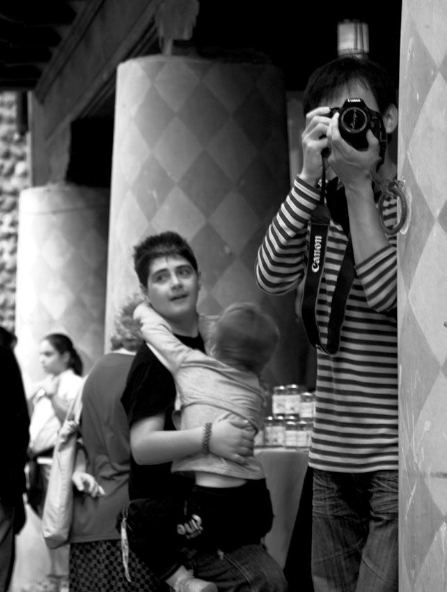 nel fotogramma c'è una bella rappresentazione: il fotografo in postazione, come fosse un cacciatore, nel nostro caso un cacciatore di attimi...e dietro di lui tuttol'environment, l'ambiente in cui vive e si muove, costellato da una serie di personaggi, ognuno con una propria caratteristica, pronti per essere catturati, rendendo efficace qualsiasi immagine, si potrebbe definire le prede del fotografo-cacciatore.