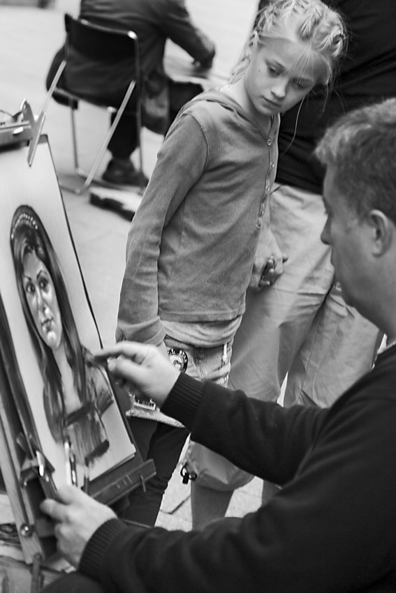 Affronti un tema molto abusato, quello degli artisti di strada e riesci a creare un buon lavoro. Il pregio maggiore è stato quello di puntare l'attenzione sullo sguardo della giovane spettattrice gustando il suo curioso atteggiamento. La lettura di questo strutturato fotogramma inizia di qui. L'attrazione che l'immagine del volto umano esercita su di noi è talmente forte da indurci a prestare attenzione a qualsiasi volto appaia chiaramente visibile nella fotografia. Da questo volto si crea una linea di forza impressa dalla direzione degli occhi della fanciulla che conduce all'opera dell' artista, anch'essa ritraente un volto umano quindi con la stessa potenzialità di catturare l'attenzione. Da qui lo sguardo rimbalza negli occhi dell'artista stesso per chiudere il percorso e far prendere coscienza dell'ottima struttura triangolare che domina la composizione dell'intero fotogramma: struttura triangolare dove i vertici sono dati dai tre volti umani e che conferisce ordine ed una piacevole combinazione di dinamismo e stabilità. Funzionali allo scatto sono la presa della mano fra la bambina e il babbo ma anche la sedia con un nuovo arista sulla parte alta del fotogramma.