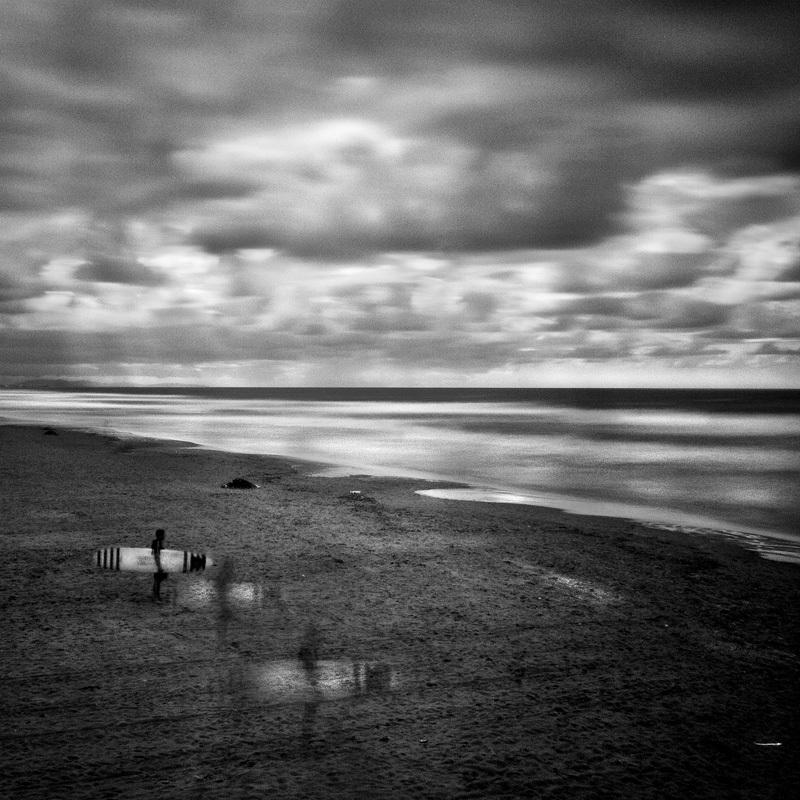 IL movimento del cielo non è abbastanza da aver creato il classico effetto delle lunghe esposizioni. Visto così si ha come l'impressione di una semplice immagine mossa, non riuscita. La superficie acquea invece rivela il lungo tempo di posa e poi il ragazzo con la tavola con le sue immagini fantasma che però non mi sembra evocare un gran che.