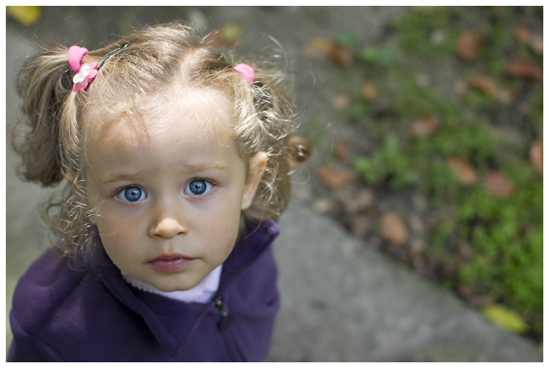 Attenzione alla luce forte che investe il viso, ha creato un'ombra forse non piacevolissima e netta sulla parte superiore del nasino, che risulta segato a metà da un brusco confine luce oscurità. Anche se illumina giosamente la fronte ampia e i riccioli biondi.
