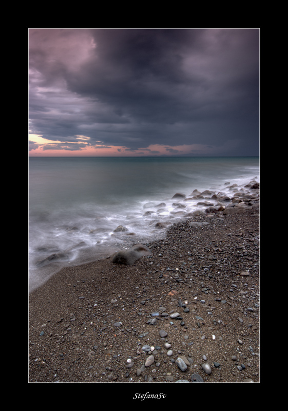 La diagonale della risacca con la schiuma bianca riempie di luce l'insieme e rende meno cupo quel cielo tempestoso.
