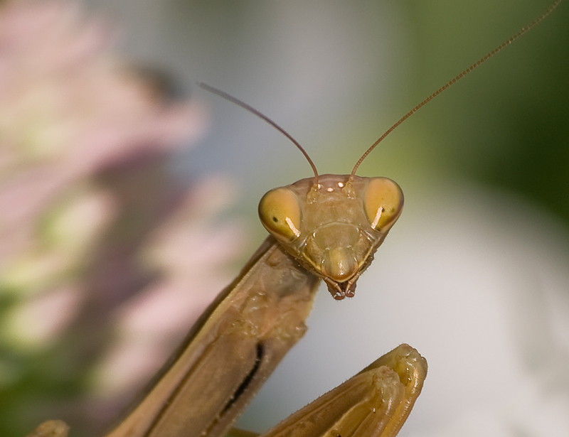 La composizione non mi esalta. Il musetto però è a fuoco, anche se un filo di mdc e di contrasto non ci sta malaccio. I riflessi sugli occhi tolgono fascino alla mantide sorniona
