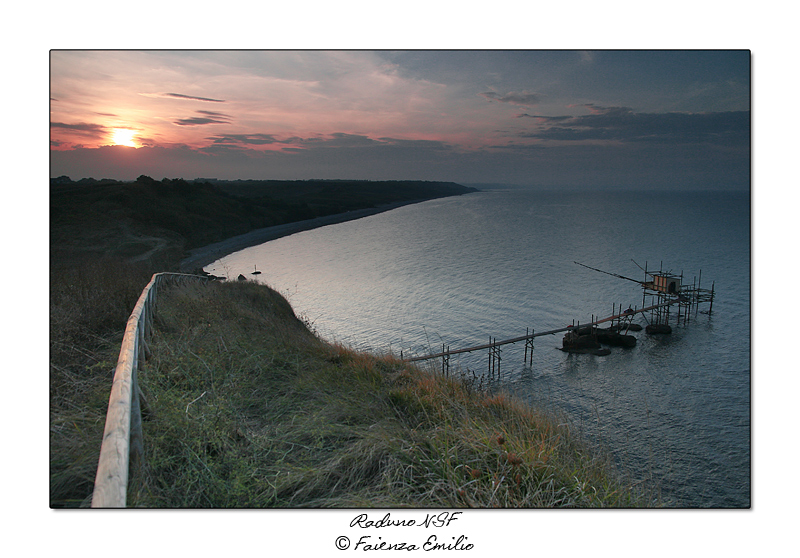 bella foto emilio... chissà come mai mi pare di aver già visto questo posto . L'hai costruita molto bene, facendo dialogare tra loro gli elementi presenti: la recinzione conduce lo sguardo verso il sole, il pontile conduce lo sguardo verso il trabocco, il trabocco (o trabucco ) con la sua lunga "canna da pesca" conduce invece lo sguardo verso il sole. L'atmosfera c'è tutta, grazie alla luce del tramonto. L'unico appunto che posso farti è che a mio avviso la zona di terra sotto il sole è troppo scuro (presumo a causa del filtro graduato), personalmente provvederei in un qualche modo a schiarirla in modo tale da renderla luminosa quanto l'erba in primo piano