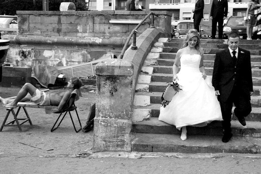 Un buon scatto Luca: la composizione della scena è gradevole con questa dicotomia narrativa che vede sulla destra del fotogramma un momento formale, elegante ed intenso rappresentato dai due dinamici sposi ed uno molto informale, dimesso, trasandato sulla sinistra, inscenato del giovane in atteggiamento di immobile e trasandato relax. Mi piacciono molto i contrasti di contenuto nella fotografia street e questo viene presentato in maniera funzionale dividendo la street-scene con il muro esterno della scalinata. Il taglio del piede che hai menzionato è un errore che infastidisce, L'abito della sposa è sovraesposto e l'abito dello sposo presenta dei neri molto chiusi che impediscono la lettura dei dettagli.