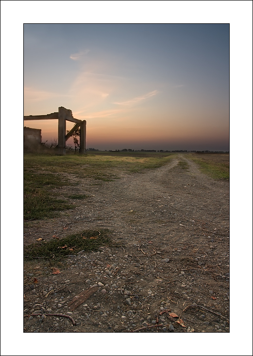 Come mi è successo anche in altri casi, dalla miniatura mi dico: stavolta Baistro l'ha padellata, questa mi pare proprio insignificante... Poi la curiosità prevale, la apro e devo ancora una volta ricredermi. E' molto bella, di quella solita bellezza sottile delle tue foto che non si impongono con effetti plateali; una bellezza che nasce da una visione d'insieme, qui una struttura spoglia e una strada sassosa 'anonima' che si perde in lontananza in in mondo di luce quasi crepuscolare; il tutto condito da una estrema cura del dettaglio, con una presa dal basso di un primissimo piano nitido e dettagliato di sassi cocci legnetti e terra polverosa. Come ha detto Damiano, riesci a rendere interessante e degna anche la desolazione. Un ottimo esempio di una foto che comunica emozioni, per me. Notevole.
