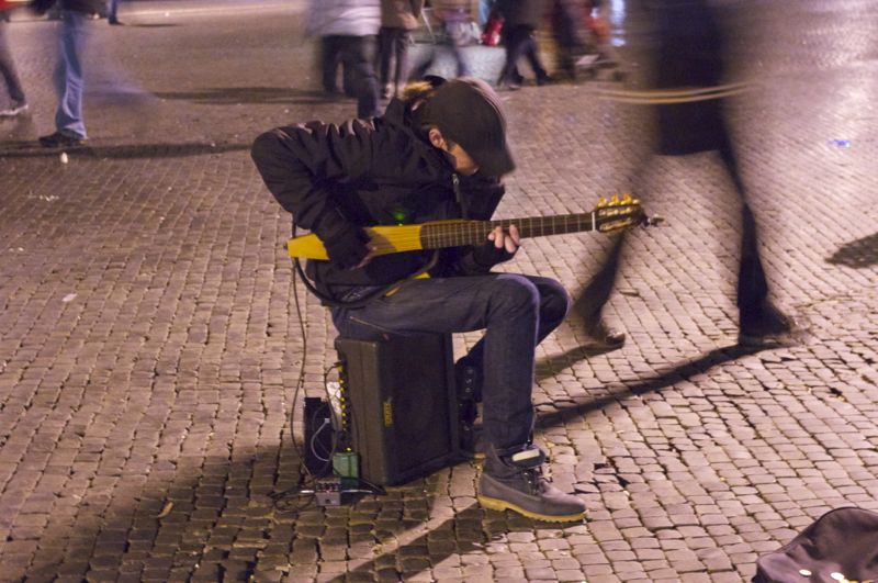 Benvenuto nel Forum, tanto per cominciare. Era buona l'intenzione di riprendere il musicista di strada con i passanti che tutto intorno passano (per l'appunto) e vanno (distrattamente) per i fatti loro. Però meglio evitare in genere di mettere al centro del mirino il soggetto (qui era preferibile avere più aria a destra), meglio cercare di non sovrapporre il protagonista ad elementi che "sporcano" l'immagine (il gran movimento sulla sua testa), meglio cercare di ottenere un'immagine più pulita possibile (pensa cosa sarebbe con il solo musicista ed il passante sulla destra). Per quanto riguarda la custodia della chitarra con su le monete sono d'accordo con Claudio R.: meglio se ci stava, oppure non ci doveva stare del tutto.