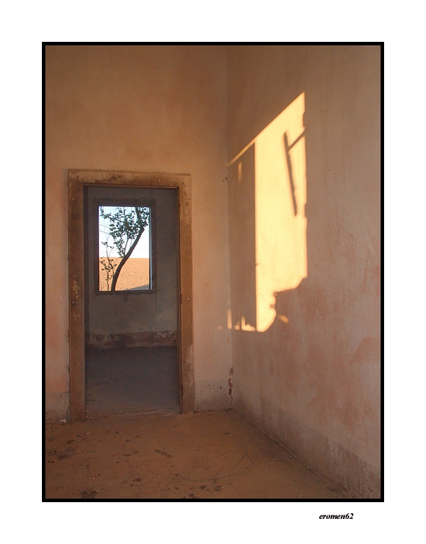 Trovo valido aver decentrato l'asse dell'immagine verso sinistra con la postazione della porta nel suo angolo di visuale che apre lo sguardo verso un alberello cresciuto dietro la finestra e più in lò uno spazio che non si lascia indovinare ma presuppone silenzio e ariosità.