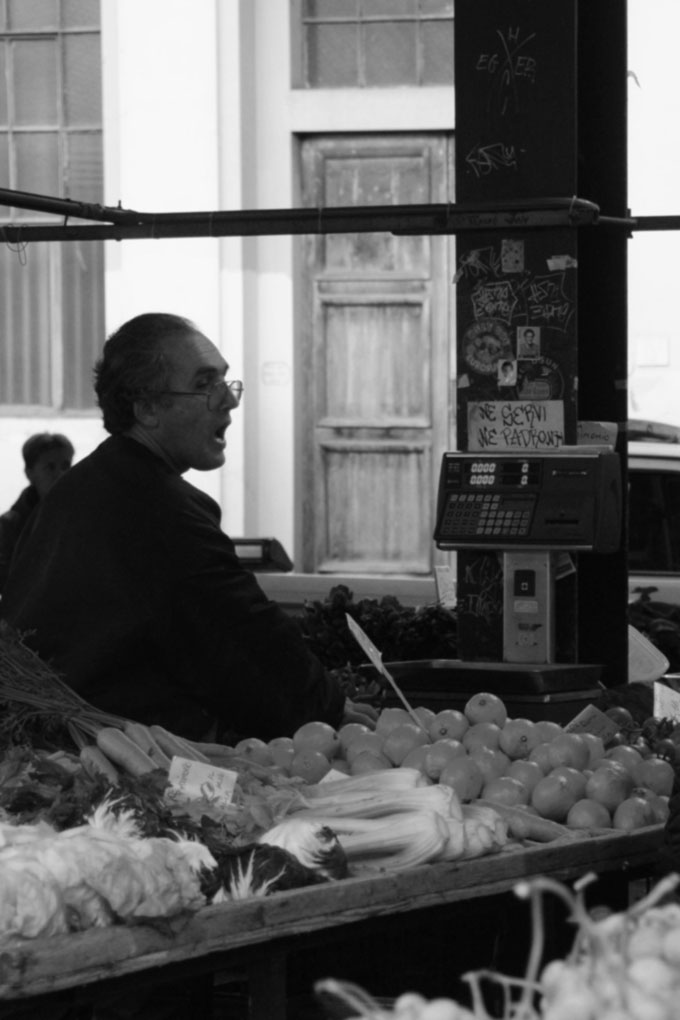 il fotogramma se da un lato rivela una piacevole profondità soffre per la mancata decisione di fissare una gerarchia di importanza fra i vari elementi narrativi. Non è visibile un piano specifico a fuoco per iniziare a leggere la tua fotografia e dare il guisto valore ai vari componenti. Il volto del fruttivendolo è espressivo, le fotografie e le scritte davanti a lui molto interessanti; lo stesso dicasi per la frutta fresca, ben in mostra in primo piano, e sullo sfondo la figura umana appena intravista e leggermente giustapposta al venditore. Tutti elementi interessanti,visti da un'ottimo punto di vista ma che non vengono valorizzati da questa mancanza di fuoco generale. Il bianco e nero contribuisce a rendere lo scatto meno vivo di quello che potrebbe rendere. Uno scatto esguito con intuito ma con il suo potenziale non sfruttato.