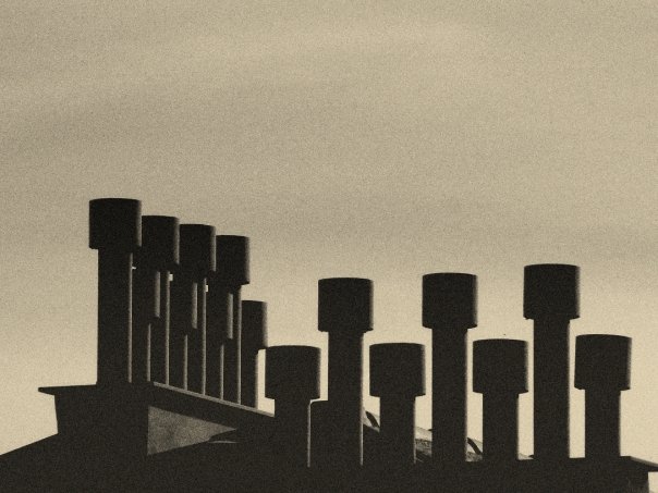 Ciao Enrico, mi piace questa foto essenziale, un forte controluce che rende la composizione di comignoli quasi un astratto, salvando tuttavia i volumi grazie a quella poca luce di taglio che li colpisce dalla destra.