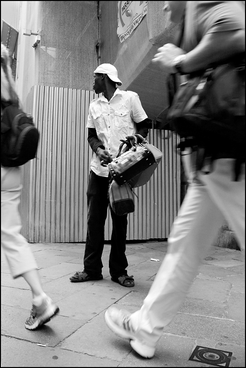 C'è agitazione nel fotogramma, energia, inquietudine. L'ansia del venditore ambulante viene incorniciata magnificamente dalla frenesia dei passanti, turisti con scarpe da ginnastica comode per lunghe passeggiate e zaini per le necessità giornaliere. Composizione ottima con una cornice dinamica che crea una triangolazione con il ragazzo di colore, introdotto con ulteriore energia da quell'avambraccio sfuocato e mosso. Siamo su quello sguardo voltato, sul patema, sulla tensione, sulla preoccupazione di essere scoperto in flagrante dalle autorità e perdere quel poco che possiedono. Provo tenerezza e non mi preoccupo più di tanto perchè sò che basta un avvicinamento, una parola amica per trovare quel loro bel sorriso bianco pieno di gioia che non aspetta altro che empatia.