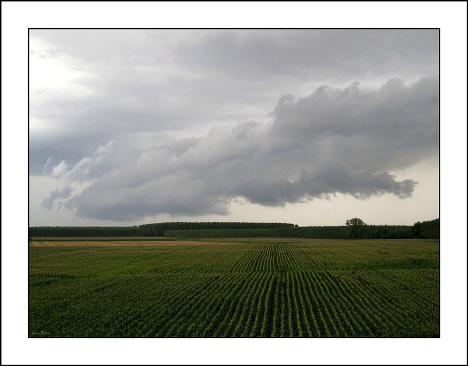 Certamente una facile composizione con pochi elementi in campo ma è anche una semplicità interessante per l'intreccio delle linee dei solchi coltivati con l'orizzonte e le file degli alberi...ma anche per come la nuvola prenda posto nella parte alta del fotogramma...