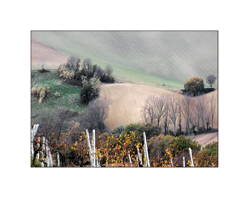 Più pittorica che fotografica, tenue e delicata, proprio non mi riesce di farmi piacere i pali in cemento che reggono i filari.
