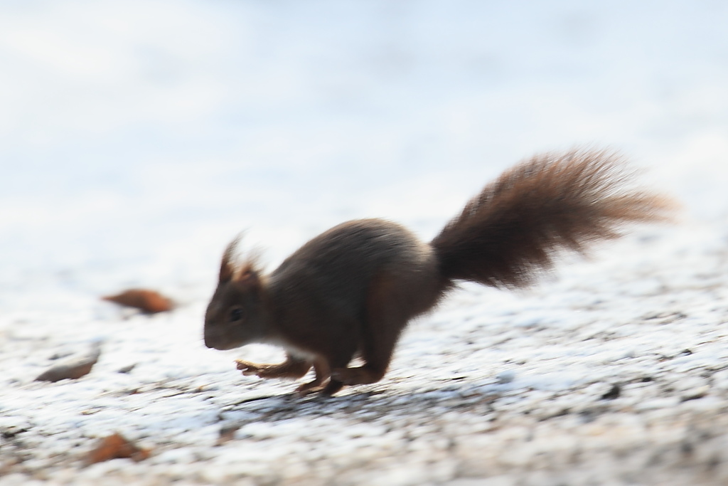 L'idea di rapidità e movimento di questo scoiattolo, quasi in un panning, sono ben rappresentate. Semmai cercherei di scurire un po' qualche zona del fotogramma per creare un maggior contrasto visivo e un po' di profondità nell'ambito generale dell'immagine, qui quasi monodimensionale.