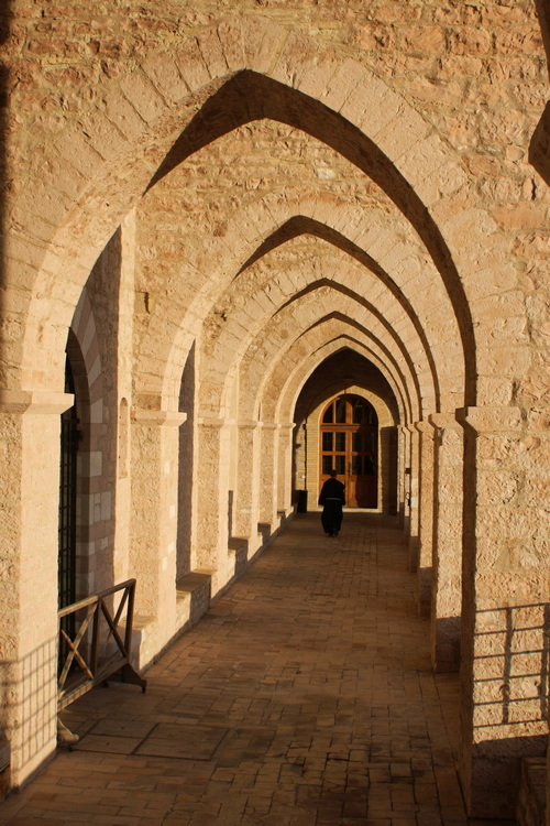 La fuga delle arcate fa da cornice grafica e segna un ritmo nella foto, mentre la presenza del frate dà significato e connotazione all'ambiente.