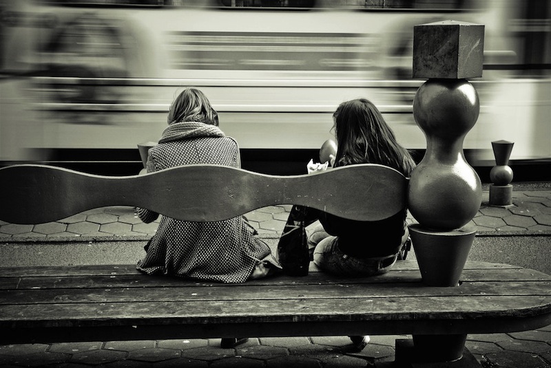 A me invece la foto non dispiace, non mi piace il viraggio mentre trovo interessante la staticità dell'attesa (appunto) con la notevole dinamicità del mezzo di fronte ai due soggetti.