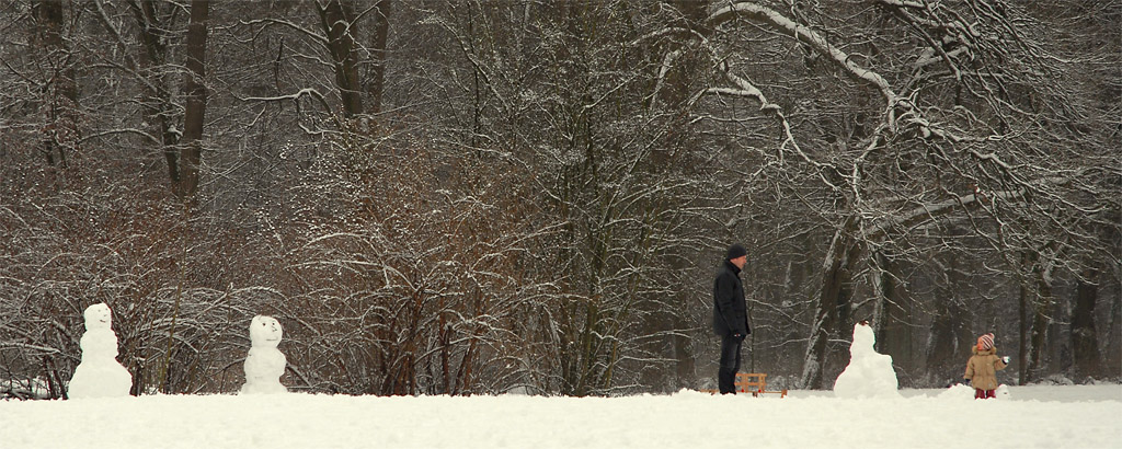 hai colto una simpatica scenetta dove i pupazzi di neve sembrano guardare con soddisfazione il loro "pupazzetto figlio" giocare con il cucciolo d'uomo....