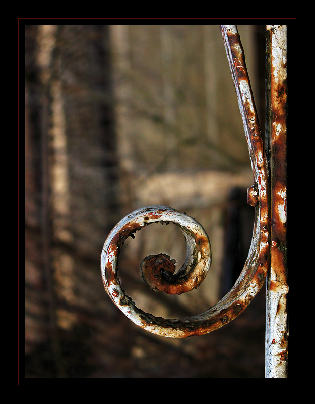 ruggine color fuoco....su questo riccio che una volta era tutto bello dipinto di bianco....Il messaggio di questa tua foto: ..."nell'abbandono c'è calore...e amore"