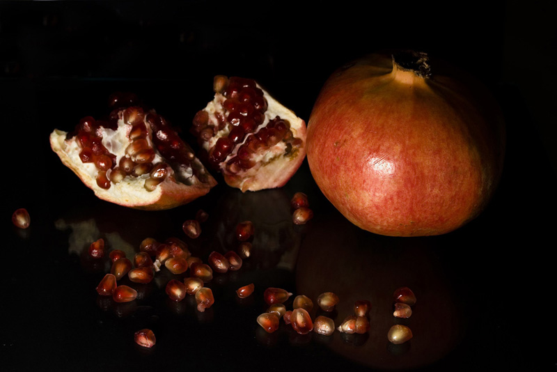 La luce è piatta e crea un brutto riflesso sul melograno, il soggetto ed il set non si abbinano affatto, l'inquadratura è storta ed in generale non vedo nulla che valorizzi il frutto in questione... secondo me si può fare di meglio nel campo dello still life! Ok!