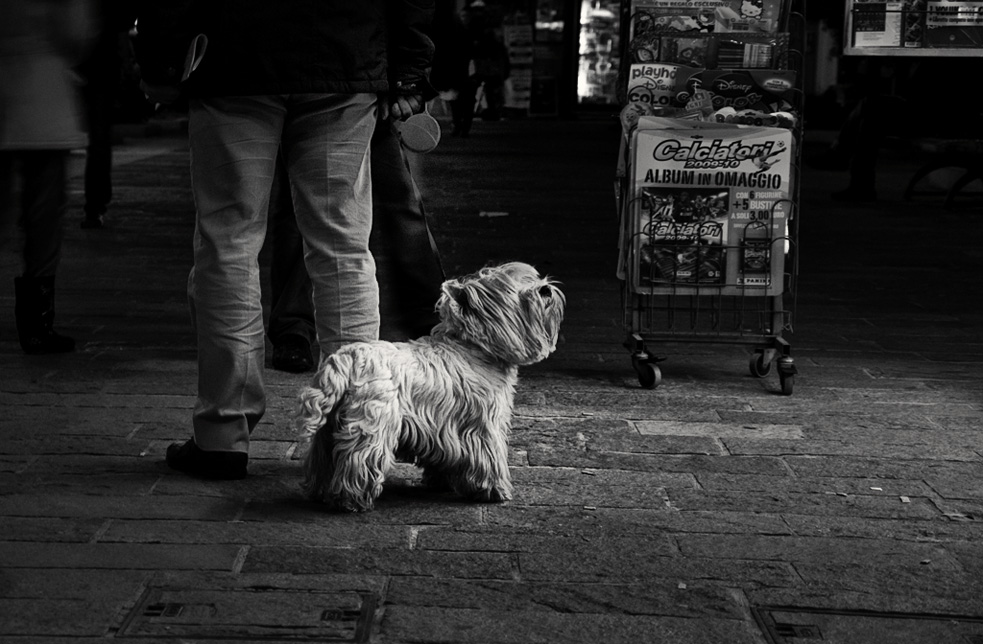 La luce controllata, quieta, fa letteralmente risplendere la sagoma arruffata e simpaticissima del cagnolino, lo astrae quasi dall'ambiente, insieme al tessuto un po' spiegazzato dei pantaloni del suo padrone, ma non lo estranea affatto dal contesto.