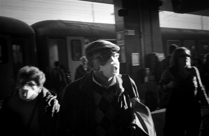 la luce giusta dipinge dei soggetti fantastici, fortemente street: la distanza è quella giusta per costruire un inquadratura pulita e armoniosa, ben composta, nonostante i ritmi serrati che un tale tipo di contesto urbano presenta. L'attimo colto è perfetto: le maschere protettive vengono illuminate meravigliosamente provocando stupore e sorpresa ma anche riflessione: paura, malattia, contagio, pandemia, virus, sono solo alcune delle parole chiave che l'immagine evoca nell'osservatore.