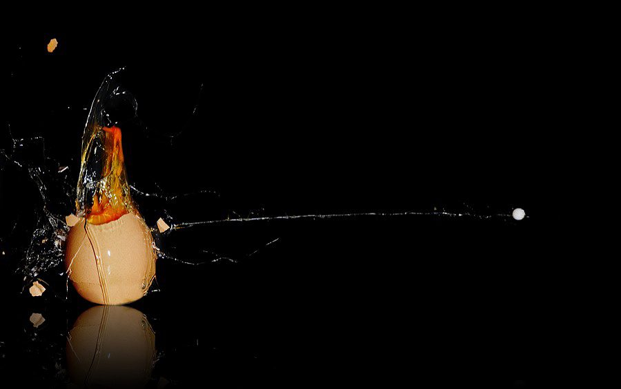Ti posso dare ragione per il margine a sinistra ma è veramente complessa come foto. La sincronizzazione fra scatto e scoppio . Considera che il pallino parte a 1joule (circa). Questa foto mi è costata 5 uova, ogniuna con una esplosione diversa. Totalmente imprevedibile se posizionarlo al centro in alto in basso destra o sinistra!!! Considera che uno è esposo come un vulcano si è staccata una porzione sopra e ha schizzato solo in alto per almeno 1 metro. Fortunatamente ha schivato il soffitto che nella stanza dove ho realizzato il set è bassino. =))) Ciao e grazie del commento
