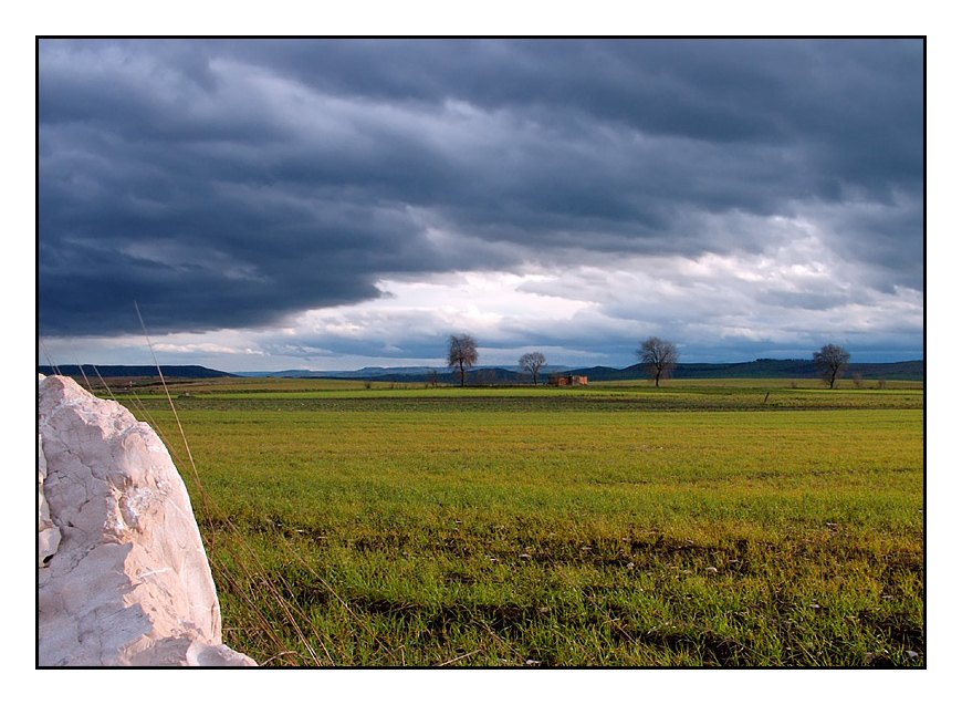 buona la luce su questa bella campagna ben introdotta dal masso rosa (ma l'hai portato lì tu per la fotografia?? ). il cielo minaccioso è ben ripreso, profondo e contrasta con la luminosità del pp.