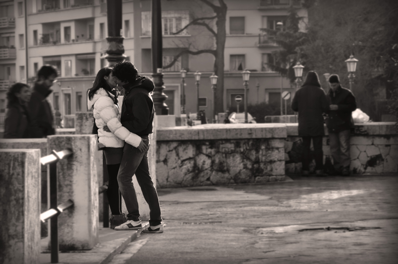 Stavo fotografando tutt'altro, ero a Verona con il mio 18-200.. questi ragazzi camminavano sull'Adige, si fermano, si baciano, ripartono.. Più veloce della luce: nella foto sembra un bacio lunghissimo, invece è stato un attimo. Avevo un bel 11 di diaframma , non ho fatto in tempo( e non l'avrei fatto comunque assolutamente) ad avvicinarmi, aprire il diaframma, sfocare, scattare senza perdermi l'attimo! Avrei oltretutto messo in imbarazzo i ragazzi, cosa che non farei assolutamente! perciò in post ho semplicemente convertito,scontornato la coppia e applicato un leggero sfocato al resto, che era un po' troppo presente..e un po' di vignettatura per focalizzare di più lo sguado su di loro. La coppia che arriva da sinistra era mossa comunque: solo gli alberi, il lampione, le persone sulla destra del fotogramma si vedevano troppo.. Smile