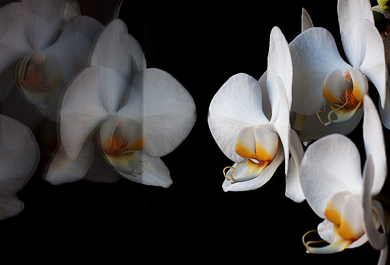 Ottima la maf, bello e ricercato lo sfondo nero...ben gestita la luce e il bianco delle orchidee...naturalissimi i colori...