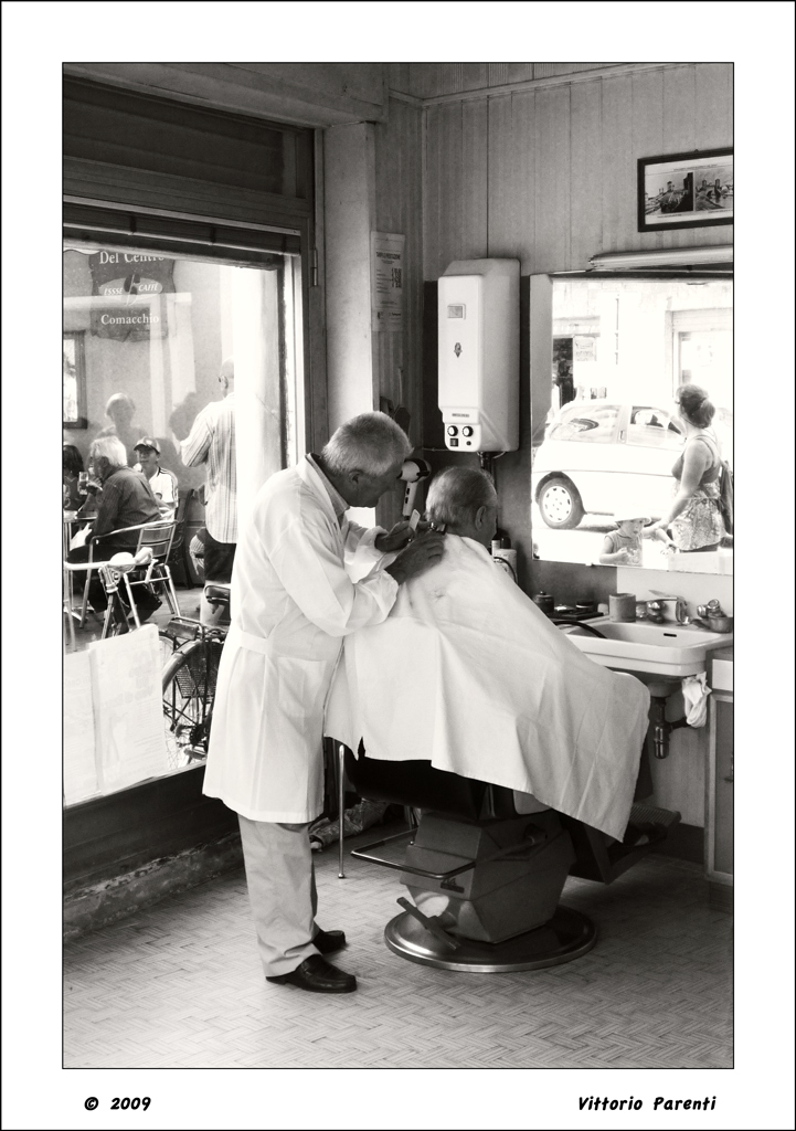 Peccato della sovraesposizione nel riquadro dello specchio, dove nel fotogramma viene mostrato di riflesso quello che succede fuori, ma sopratutto perché è li che finisce l'occhio, il mio, ma anche quello del cliente del barbiere che osserva con l'occhio maschile la forma della donna, senza malizia, ma come gesto naturale, probabilmente sarebbe incuriosito anche dalla visione di un'uomo. Ma da quel che vedo le problematiche di luce erano notevoli, giornata estiva, solare, impossibile studiarla a lungo una posa cosi, ma nel insieme la scena riesce a reggersi, a mostrarsi interessante, la pace all'interno del salone in contrasto con il caos frenetico all'esterno, la gente che passeggia, un gruppo di uomini seduti al bar, magari intenti a una partita di carte o semplicemente commentando l'ultima di campionato che a decretato il successo o l'insuccesso di qualcuno...