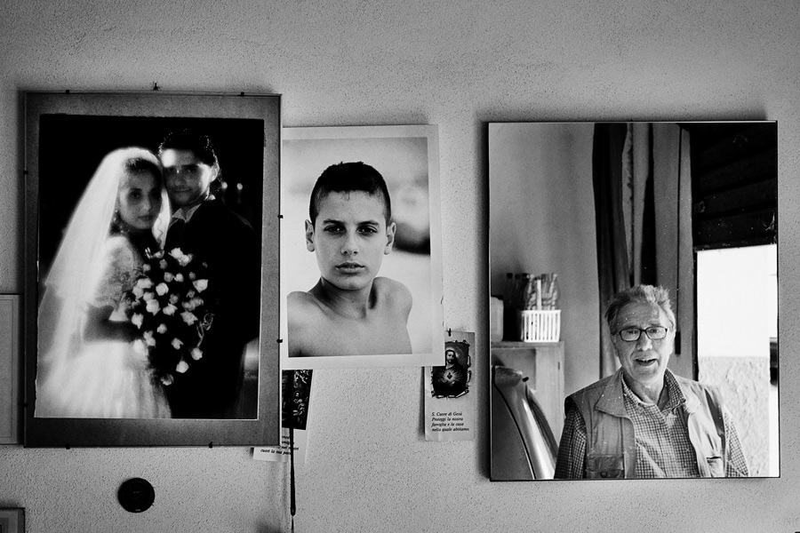 Specie in un territorio così sconfinato come può apparire a prima vista l'estetica fotografica, o più ampiamente la grammatica dell'immagine, decidere di limitarsi alle articolazioni essenziali dei saperi comuni agli autori e ai fruitori dei testi visivi, non può che apportare grandi benefici. Spingere sul pedale del soggettivismo in fotografia, come in arte, sia nel momento produttivo che in quello interpretativo, non può che condurre a confusioni e impedire uno sviluppo controllabile delle argomentazioni scientifiche. Il nemico è sempre in questi casi, l'intuizione immediata, l'incapacità di focalizzare, anche in maniera parziale i metri di valutazione e interpretazione con cui dell'immagine si può parlare per essere contraddetti, così come si argomenta dialetticamente nel linguaggio ordinario. Il nostro Penna ci propone una buona fotografia dalla caratteristica opacità e dall'esemplare composizione. La polarità del chiaro e scuro e la convergenza dei piani, mediante l'utilizzo di una messa a fuoco generalizzata su tutto il frame, rappresentano la sintassi fotografica fondamentale dello scatto. L'autore costringe lo spettatore a subire questa opacità: ci soffermiamo sulla superficie della fotografia e la nostra messa a fuoco mentale ci porta alla scoperta di queste tre cornici. Tutte e tre le cornici, (quadri e specchi), sono da leggere concettualmente paralleli, dal punto di vista dell'importanza compositiva e/o informativa, fanno parte del medesimo racconto, indipendentemente dall'ordine sx/dx di lettura (spero di aver risposto a Moebius..). La presentazione di figure diverse e il loro incorniciamento in settori diversi del testo visivo e concettuale stà qui a introdurre un’ulteriore polarità essenziale della grammatica dell’istantanea: si tratta di un contrasto diacronico. Si vuole rimarcare l’esistenza di un “prima” e di un “dopo” temporali, funzionali ad una distanza generazionale (giovane-adulto-anziano) oppure esistenziale (lo stesso soggetto in differenti momenti di vita vissuta). Non è decisiva l’interpretazione di questa polarità: essa rappresenta un contenitore di significato, uno spazio astratto, entro cui può stazionare, reificandolo, qualsiasi tipo di contenuto soggettivo. Non vi è dubbio che possiamo arricchire l’analisi dello scatto con nuovi particolari interpretativi, alcuni dei quali potrebbero non essere stati implicitamente progettati al momento dello scatto ma che possono essere ricondotti ad una spiegazione plausibile sulla base di un comune sentire che, al di là delle intenzioni originali dell’autore, unisce produttori e fruitori dell’istantanea in un ecoclima convergente. E allora come non prestare attenzione a quei simboli religiosi che intervallano le cornici e che regalano un sapore tutto religioso all’intera scena. Per essere coerente avrei voluto vedere che cosa pendeva da quel laccio che proietta la sua ombra sul muro. Un muro molto intimo che il nostro Penna conosce molto bene..