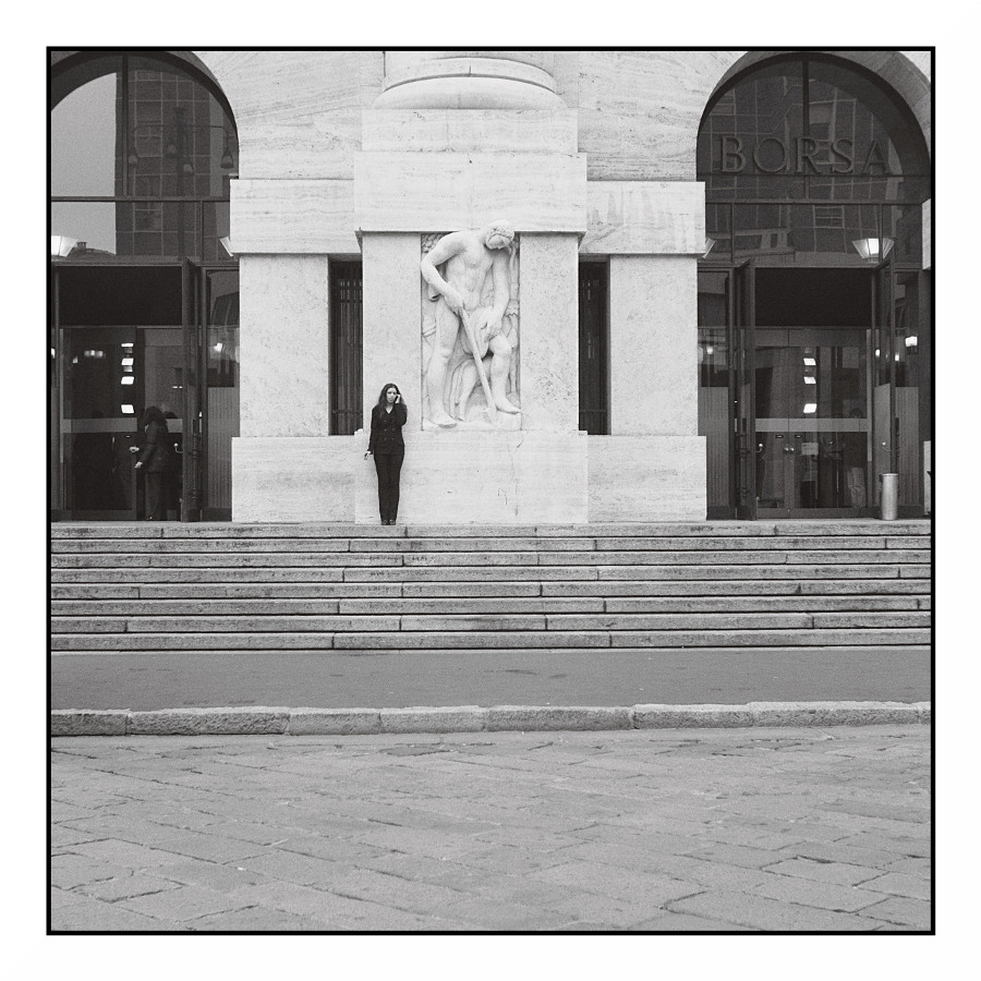 Vero, non c'è analogia tra la ragazza che fuma e la figura in marmo, posta all'ingresso di Palazzo Mezzanotte, sede della Borsa di Milano, ma è per questo che ho scattato. La ragazza che fuma lavora in Borsa dove si crea valore con le parole ed i numeri, il lavoro materiale, la produzione di ricchezze è fuori di lì. Nessuna analogia, in effetti