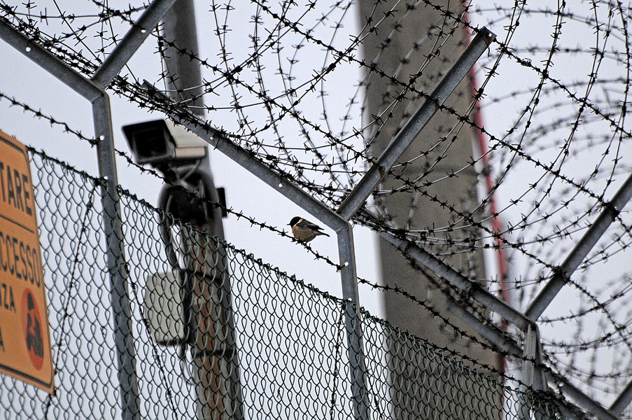 mi piace il giro di rovi del filo spinato , e il taglio che lascia intravedere l'omino che mira col fucile , il passerino in questo caso e' l'essenza dell' essere piccolino e libero .. in bilico , a meta' fra pericolo e salvezza , in un certo senso prende in giro il mondo blindato che l'uomo si e' costruito per difendersi dal nemico .