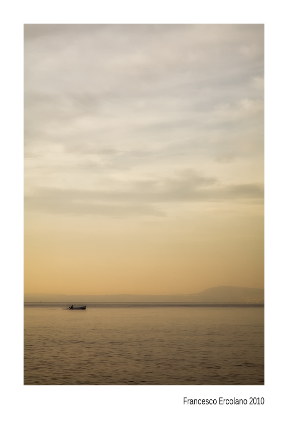 Qui, cielo e mare la fanno da padroni, ma subito l'occhio cade sulla minuscola barchetta in cui tutti noi idealmente immaginiamo di navigare.
