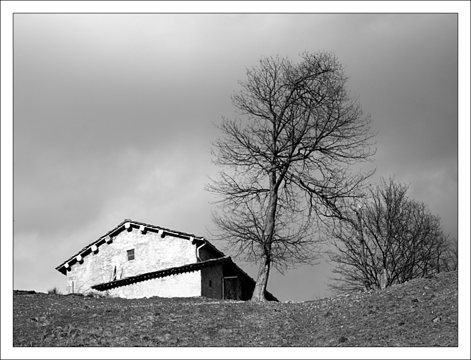 Devo sinceramente confessare di essere tra quelli che l'hanno vista senza commentare...nonostante la mia scarsa passione per i paesaggi in B&N, preferisco la prima versione...affascinante la luce...colpisce la casa illuminandola e contemporaneamente il cielo è quasi plumbeo, minaccioso...