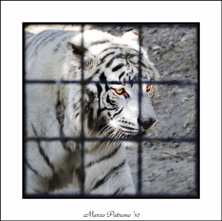 | Buona l'incisività che ricade negli occhi di questo "tenero" animale... peccato per alcuni dettagli del pelo, bruciati dalla luce. Personalmente avrei lasciato completamente nero il passepartout intorno alla gabbia metallica. |
