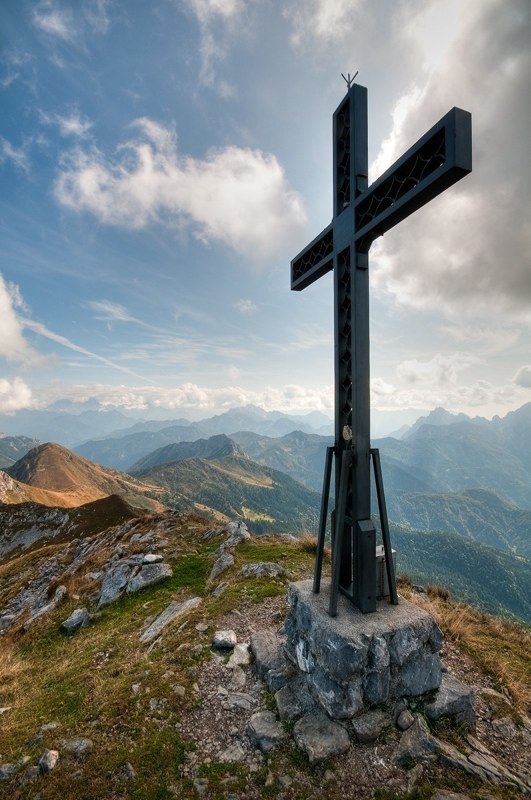 molto bella questa sgrandangolata che rende spettacolare lo scenario ripreso. Una buona fotografia senz'altro... attenzione solo agli aloni attorno alla croce: probailmente hai fatto un lavoro selettivo schiarendola, ma questo ha portato ad avere anche il cielo più chiaro nella zona attorno alla croce