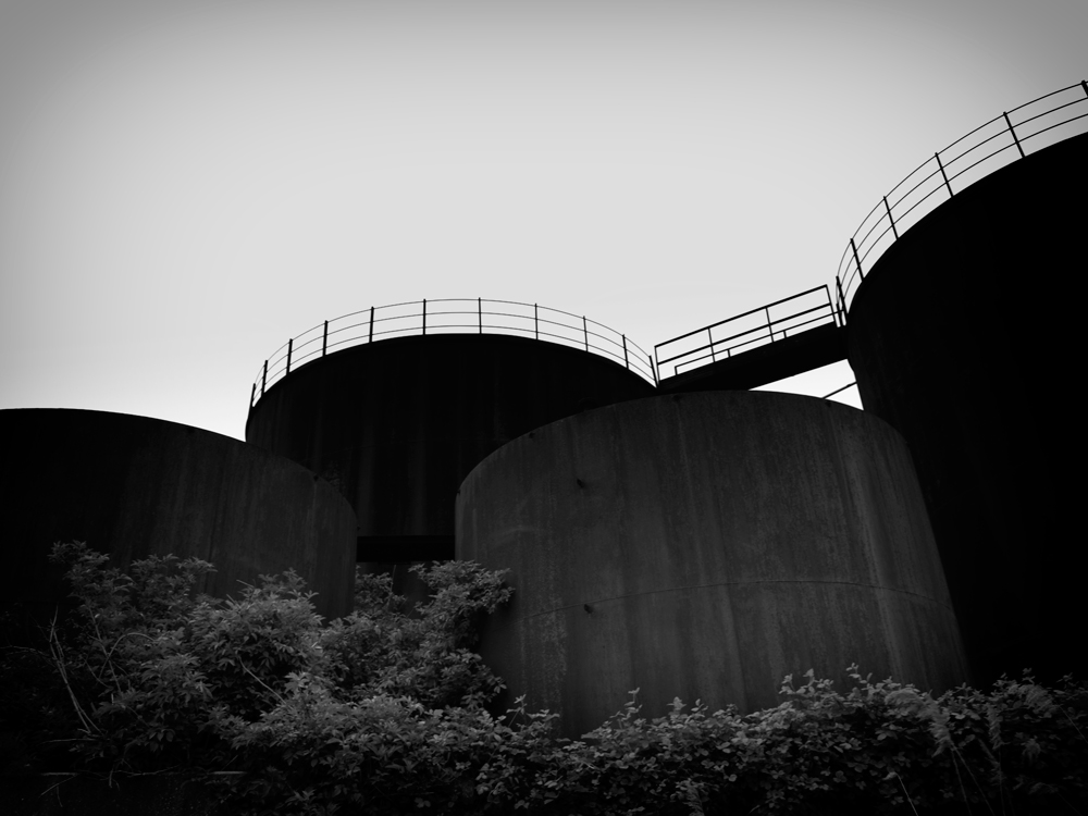 Non male la ricerca del chiaroscuro per sfruttare soprattutto la silhouette superiore delle cisterne (a riguardo avrei clcato la mano anche in basso chiudendo maggiormente col nero...)