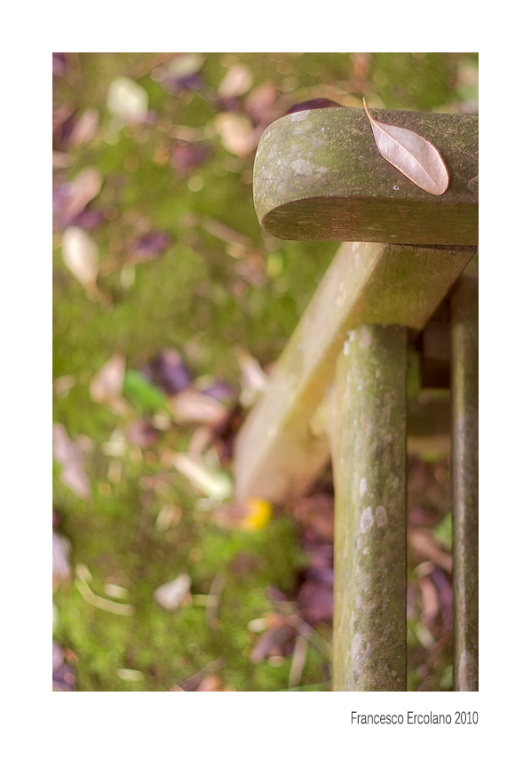Le irregolarità del boken del cinquantino, diventano in questa occasione specifica quasi un pezzo forte per la immagine. Tutto nella scena è incerto sullo sfondo, irregolare, forse un po' caotico; come ben nota Sisto, lo sguardo è come obbligato a vagare, con un filo di spiazzamento, fra le cose. Poi trova nel rosa incredibile, setoso, di una nitidissima foglia, e il suo approdo sereno. Una certezza visiva, nel caos delizioso della composizione. Così precaria nel suo giacere sul poggiabraccia: basterebbe un filo di vento... e la sua rivoluzione rientrerebbe nei ranghi. Ma è bello vederla così, ferma nel fotogramma, talmente viva la sua tessitura, che pare di poterla accarezzare con mano....
