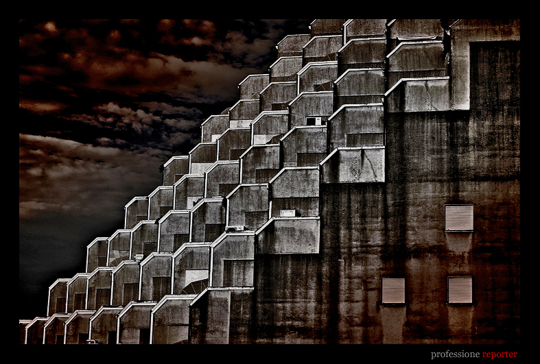 hai voluto portare in vita un'emozione, una sensazione.. un'inquietudine e una tristezza profonda che ti ha fibrillato dentro quando hai visto questi palazzoni pararsi di fronte a te.. e l'elaborazione con questi toni scuri, lugubri, duri e difficili ha centrato tale fine.. l'immagine così graffia, e diventa molto interessante.. peccato che sulla parte in basso a sinistra ti sia nata quella sorta di aura o di bagliore grigio, che disturba un po' l'inquietudine data dal bel cielo così cupo nella zona alta..