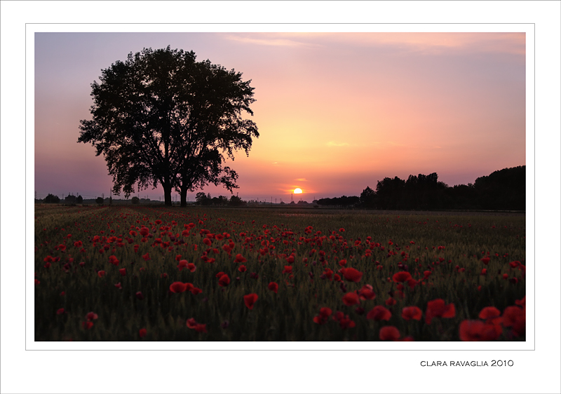 il fiume di papaveri, lambiti dalla luce del crepuscolo, portano direttamente al punto focale dll'immagine, il bellissimo albero, gigante che si staglia in bel controluce sui colori del tramonto.